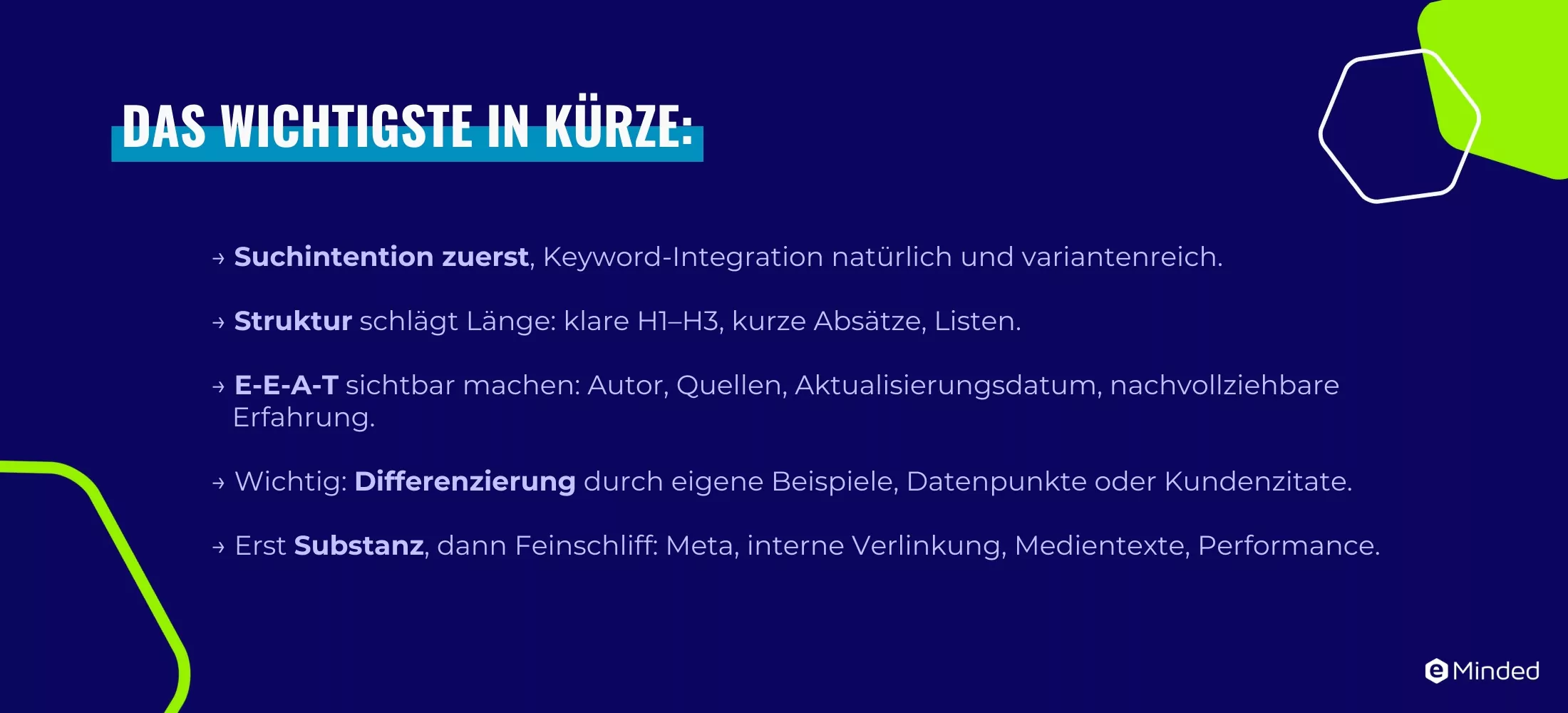Gut strukturierte Inhalte sind leichter lesbar und performen auch in Suchsystemen besser. Zwischenüberschriften, Listen und prägnante Absätze erhöhen die Chance auf Snippets oder AI-Overviews.
