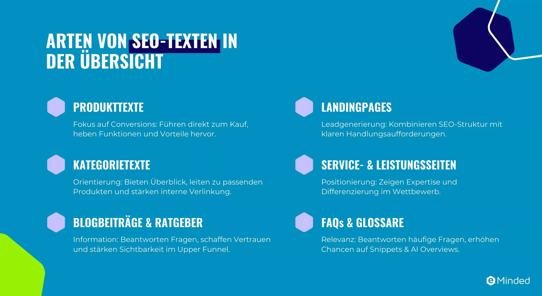 SEO-Texte sind vielseitig. Abhängig vom Seitentyp unterscheiden sich Anspruch, Länge und Aufbau deutlich. Wer die Unterschiede kennt, kann Inhalte zielgerichtet aufbereiten und so die passende Suchintention bedienen.